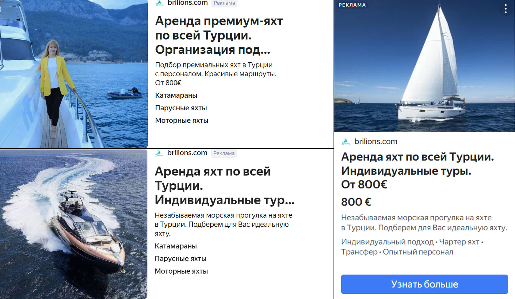 В карточках яхт у клиента изначально не было цен — это мешало запуску. Я попросил разработчиков выгрузить данные о всех яхтах, добавил рандомные цены в товарный фид и запустил объявления. Сработало: заявки пошли сразу. Параллельно чистил неэффективные площадки, дополнял объявления, оптимизировал бюджеты.