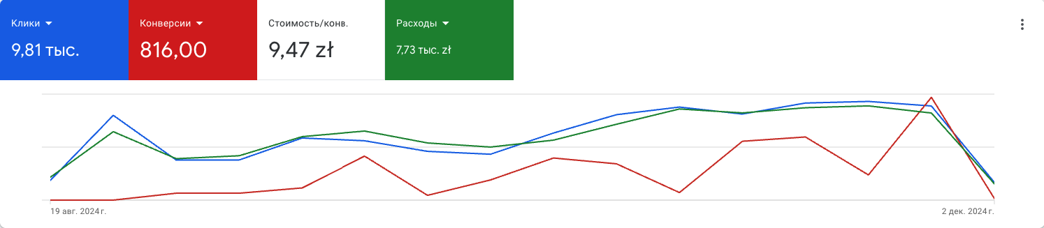 Вывод: комплексный подход, включающий текстовую и товарную рекламу, а также регулярная оптимизация кампаний позволили существенно повысить эффективность рекламы. Клиент получил стабильный поток заказов, в том числе благодаря успешной продаже маржинальных позиций через Google Shopping.